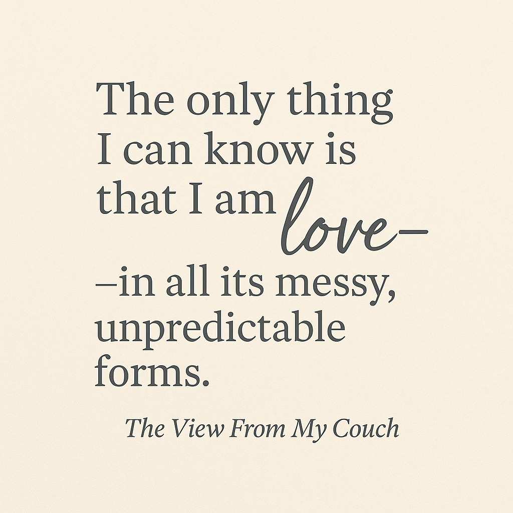 This particular round of what Byron Katie calls Earth School is fundamentally not within my control, no matter how desperately I might wish otherwise. The only thing I *can* genuinely know with absolute certainty is that I am, at my core, an expression of love itself—in all its beautifully messy, gloriously unpredictable, and sometimes terrifyingly vulnerable forms.